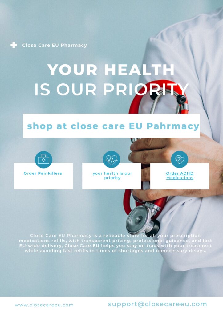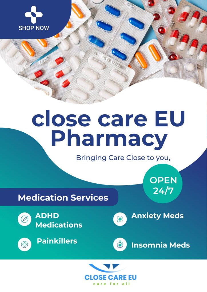 Additionally at Close care EU Pharmacy, we offer a wide range of medications from piankillers, adhd, anxiety or erectile dysfunction from range of trusted brands. Our catalog is regularly updated to ensure you always find what you need, when you need it.